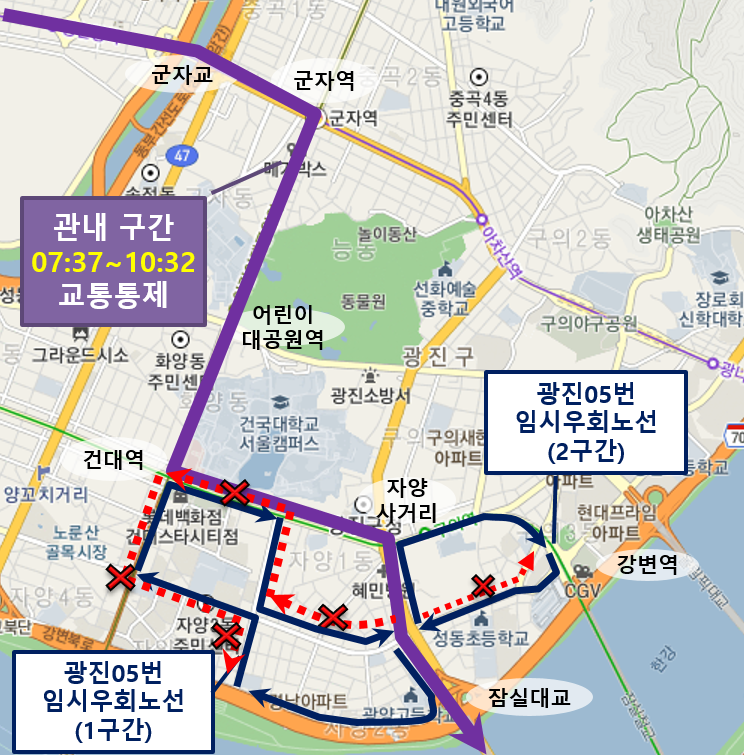- 우회구간 : (1구간) 신자초교⇒건대역⇒송림식당⇒신자초교 교차로⇒잠실대교북단교차로⇒자양강변길⇒신자초