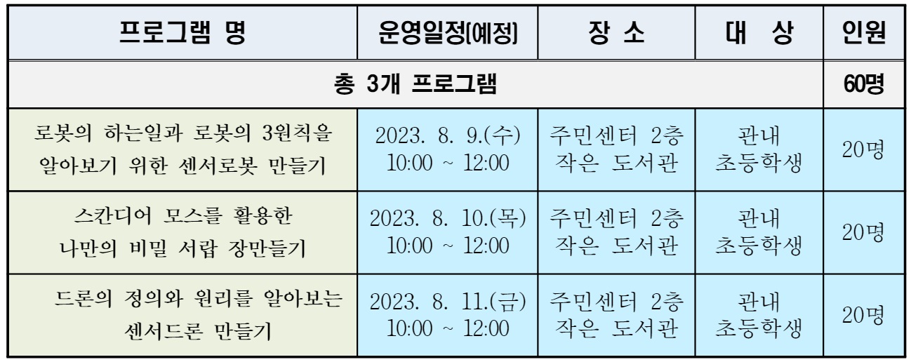 ○ 참여대상 및 인원 : 관내 초등학생 20명(프로그램 별 선착순 접수)