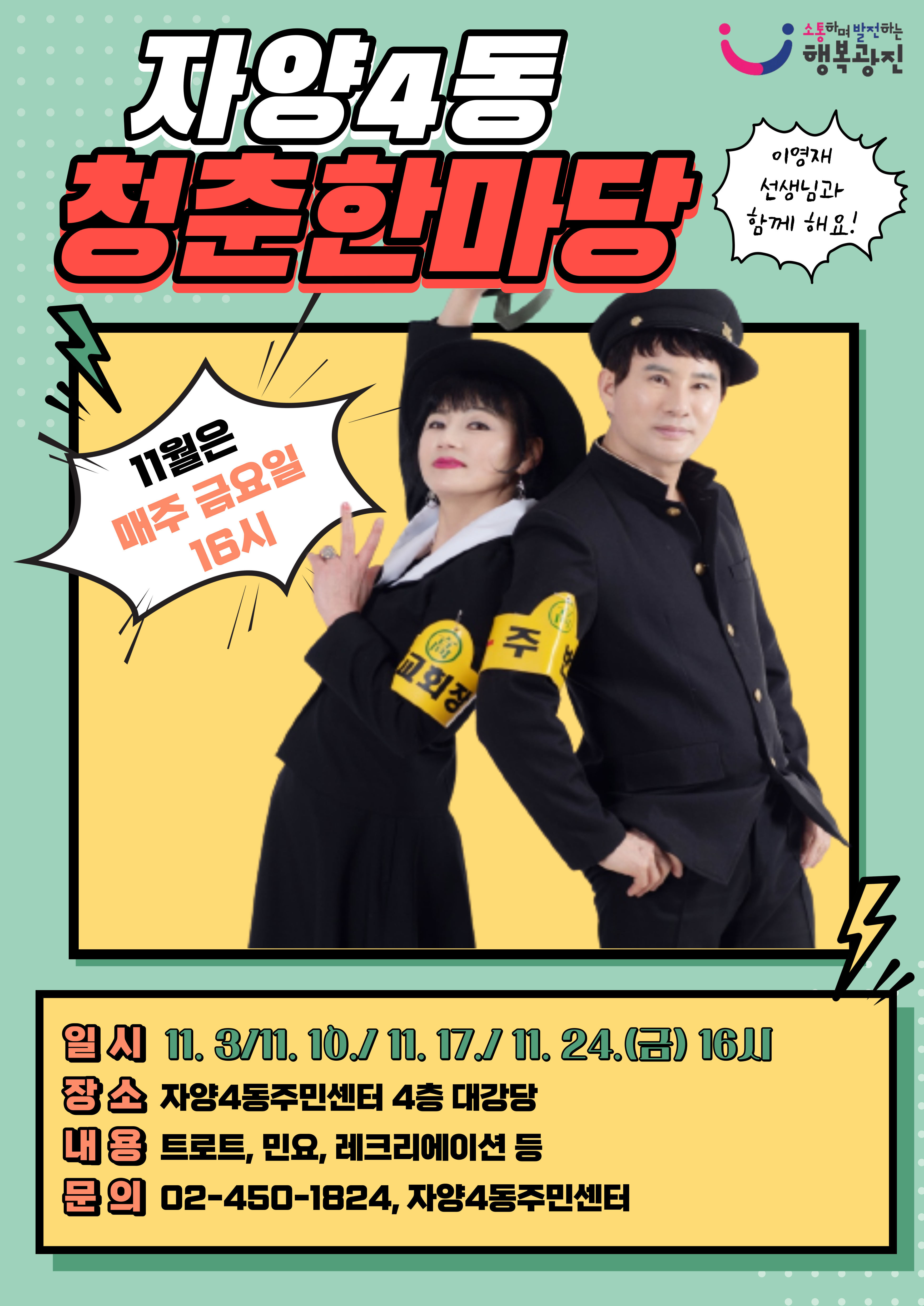 11월 자양4동 청춘한마당 매주 금요일 16시에 찾아갑니다. 많은 참석 요청드립니다.