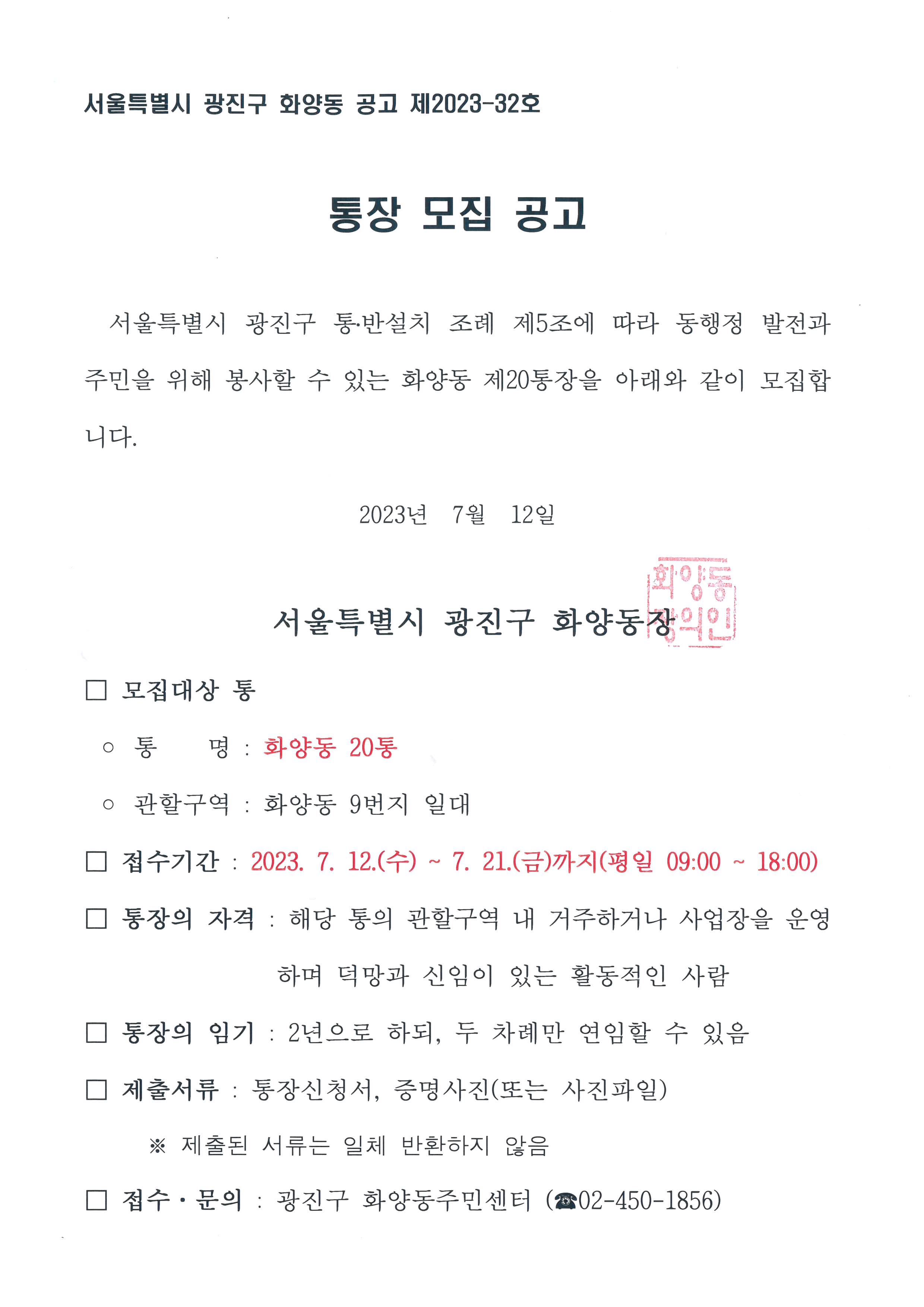 화양동 제20통장 공개 모집 공고