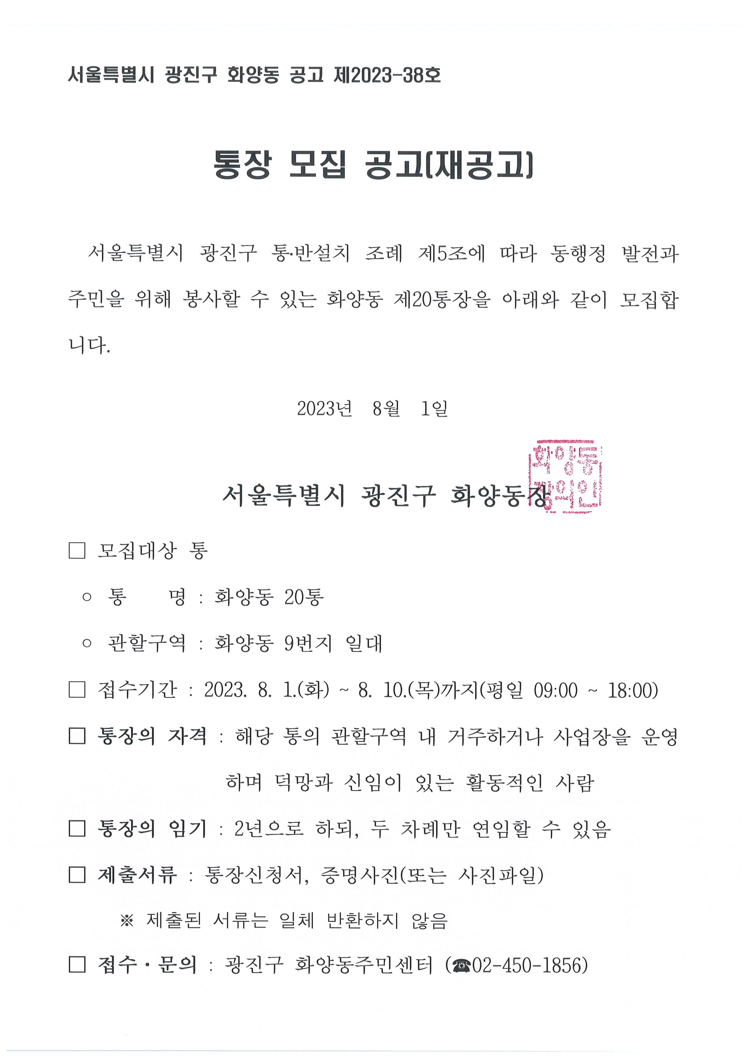 화양동 제20통장 공개 모집 재공고