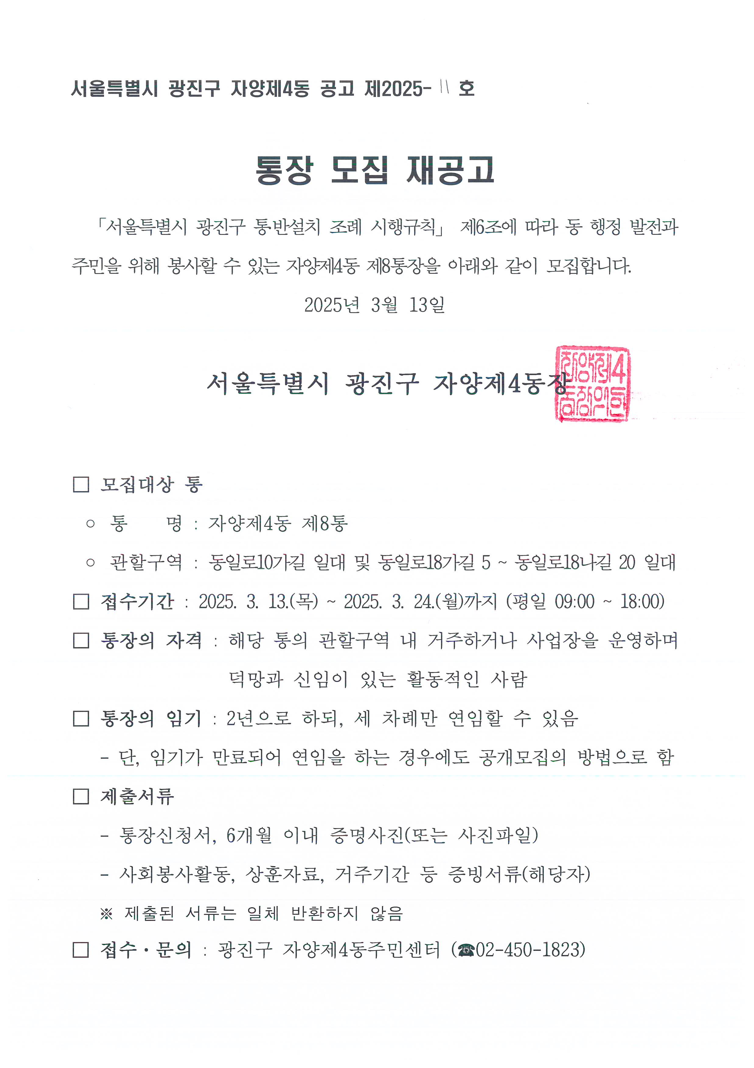 통장 모집 재공고(제8통, 제24통).