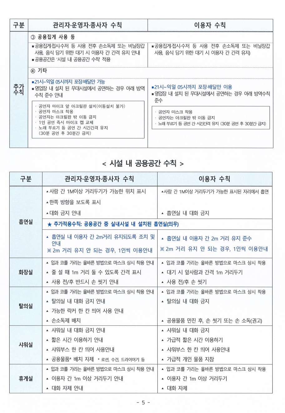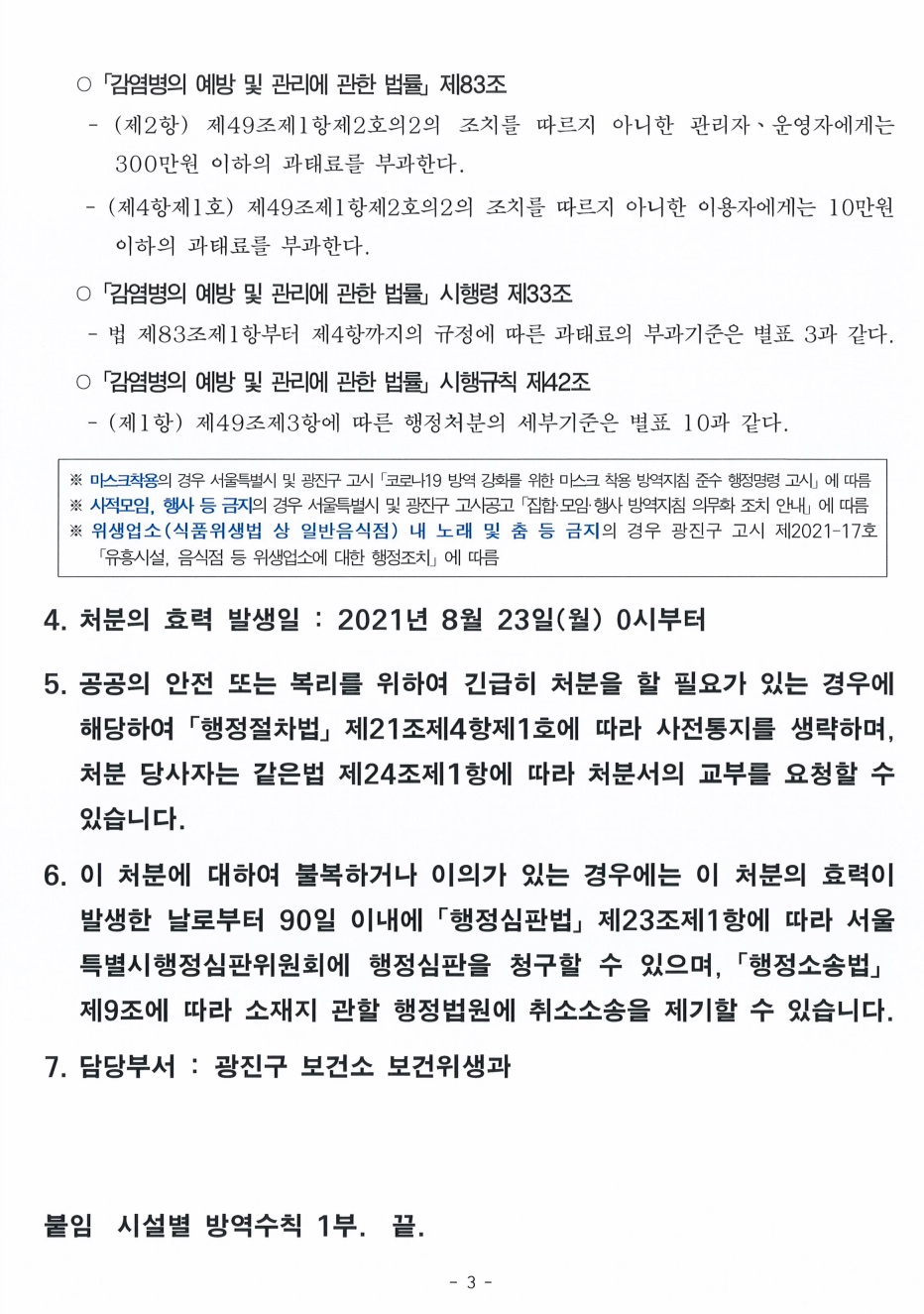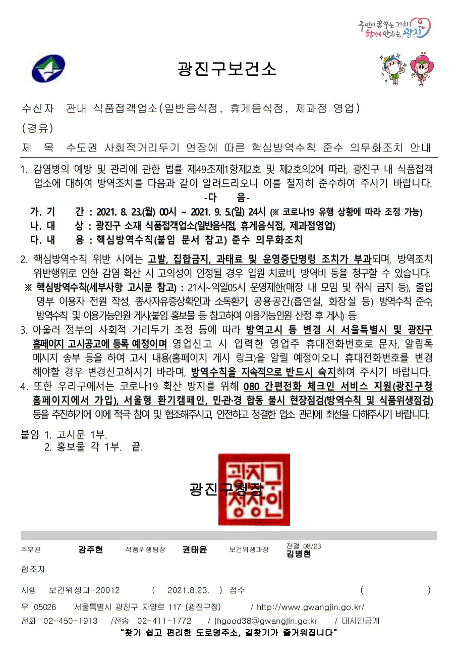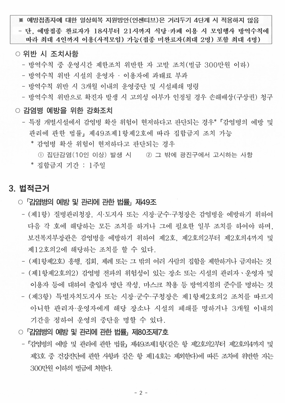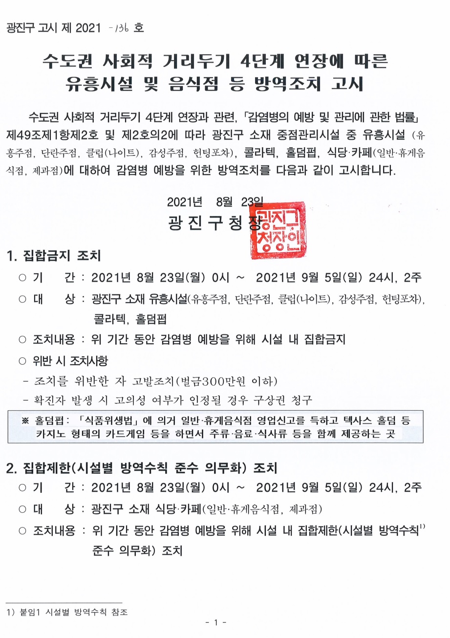 사회적 거리두기 4단계 연장에 따른 목욕장업, 이·미용업, 숙박시설 방역조치 고시(광진구 고시 제2021-135호)
