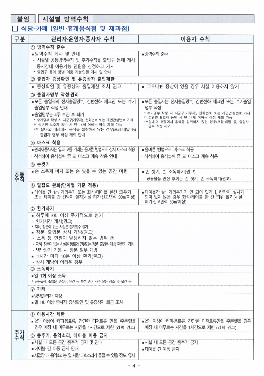 수도권 사회적 거리두기 4단계 연장에 따른 유흥시설 및 음식점 등 방역조치 고시