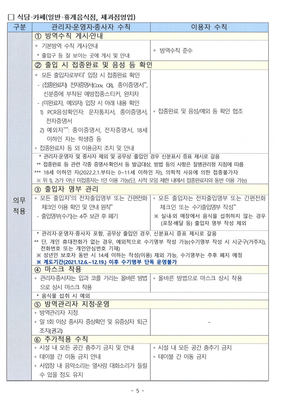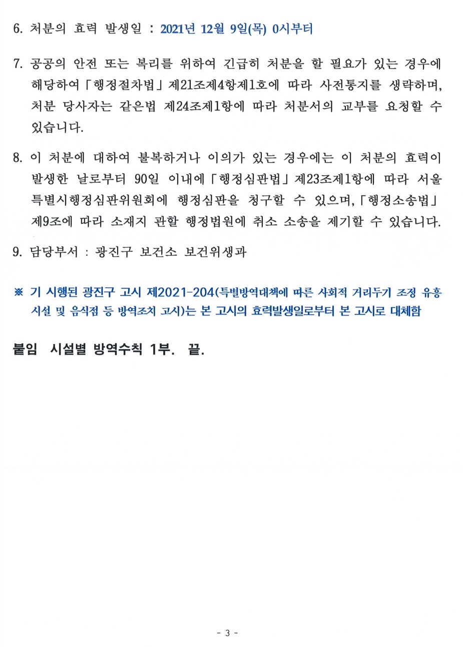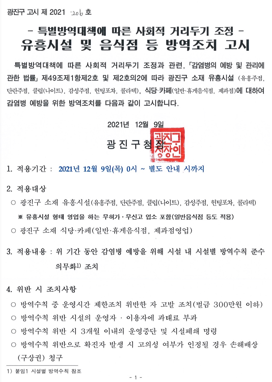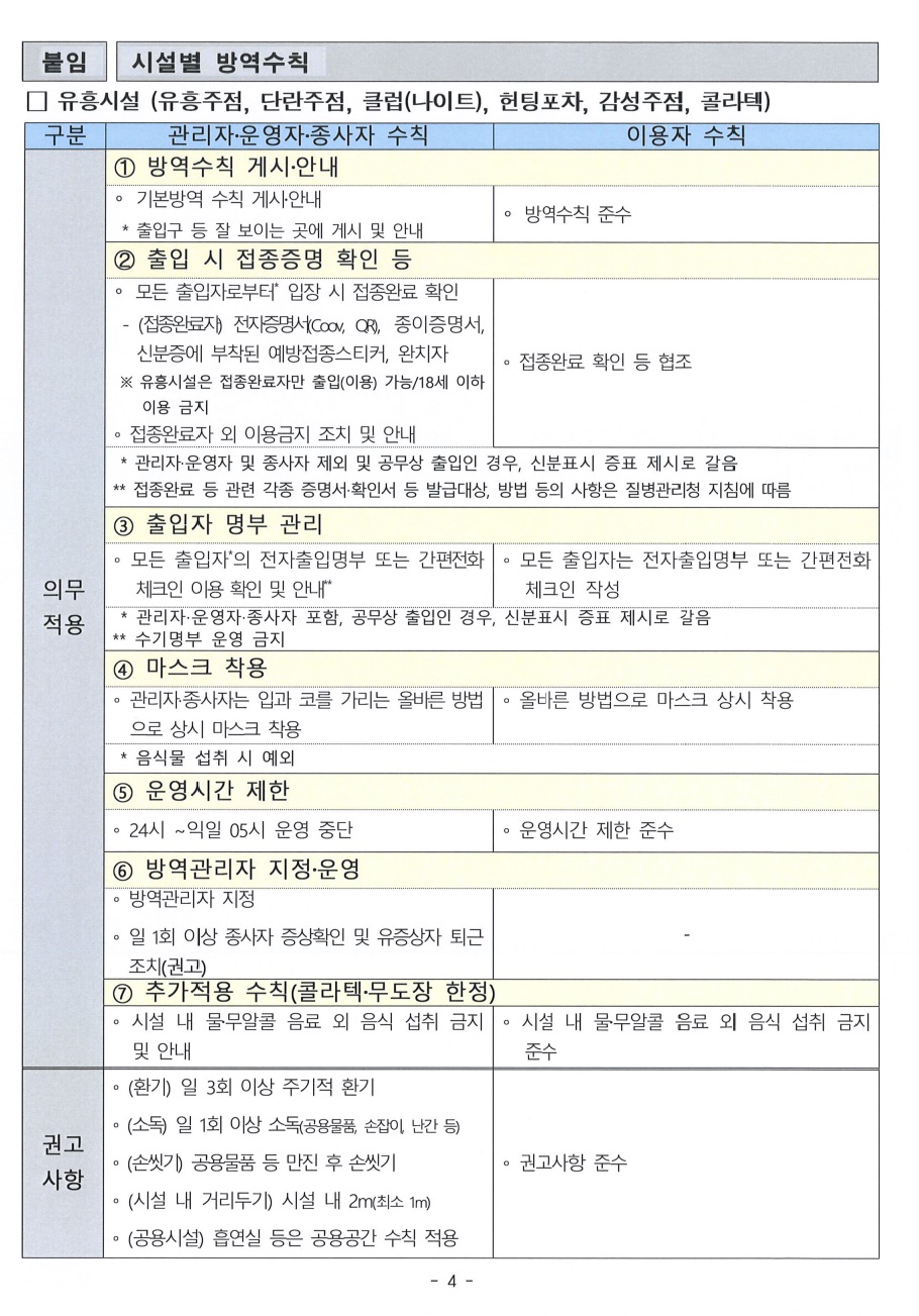 특별방역대책에 따른 사회적 거리두기 조정 유흥시설 및 음식점 등 방역조치 고시