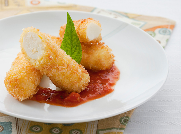 스트링 치즈 4개, 밀가루 1/4컵, 달걀 1개, 빵가루 1컵, 토마토소스 1/4컵, 식용유 적당량