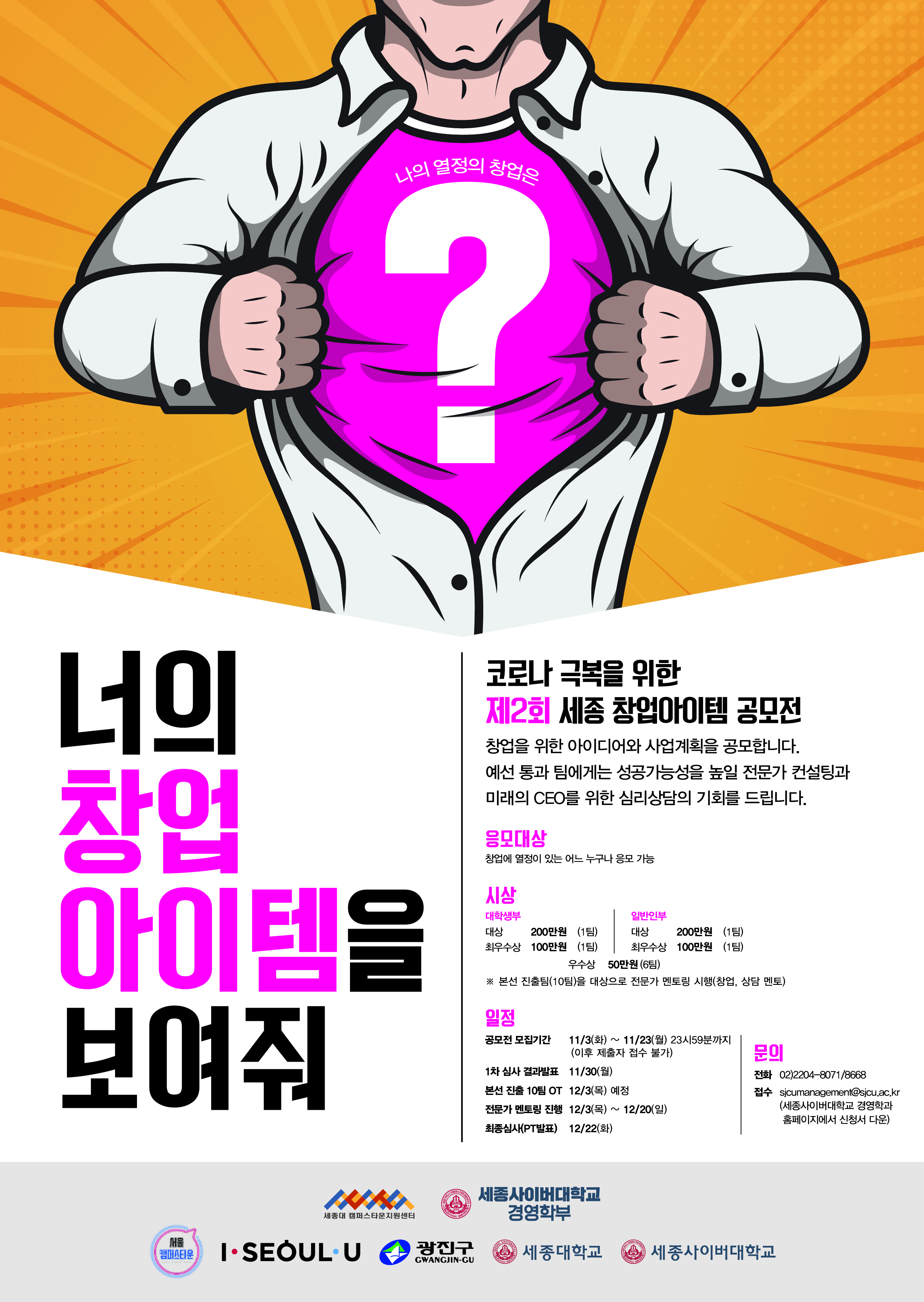 세종사이버대학교 경영학부와 세종대 캠퍼스타운 지원단의 핵심 추진목표 중 하나인 ‘일자리창출’을 위해 「세종 창업아이템 공모전」을 개최하고자 아래와 같이 모집․공고 합니다.
