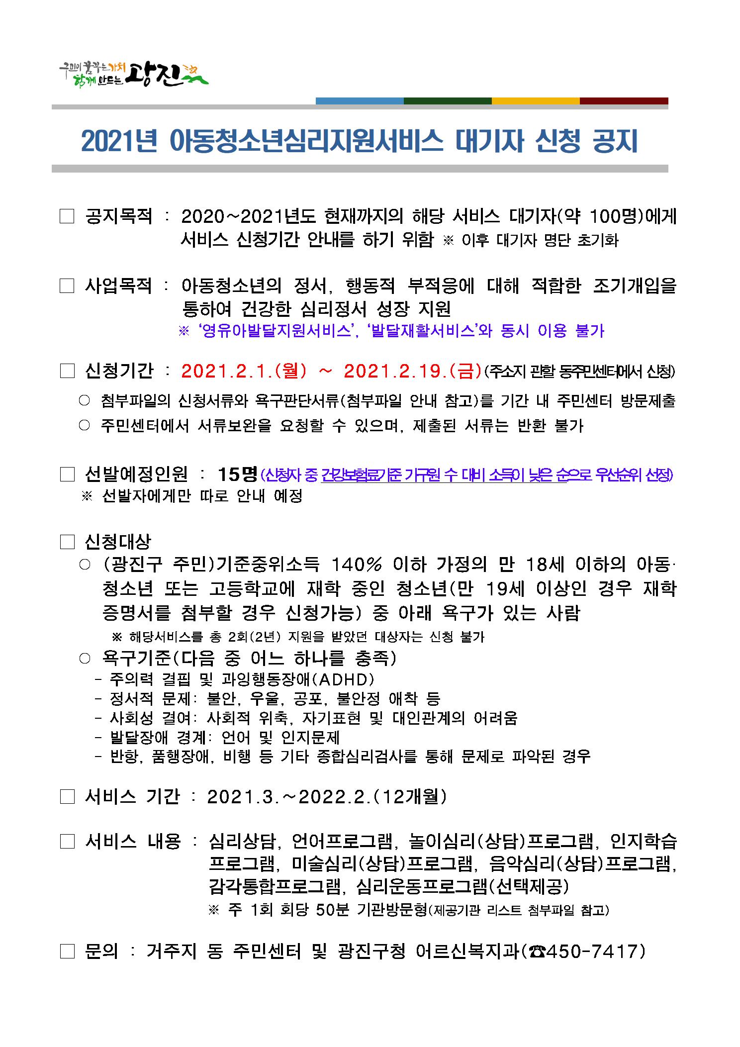2021년 아동청소년심리지원서비스 대기자 신청 공지