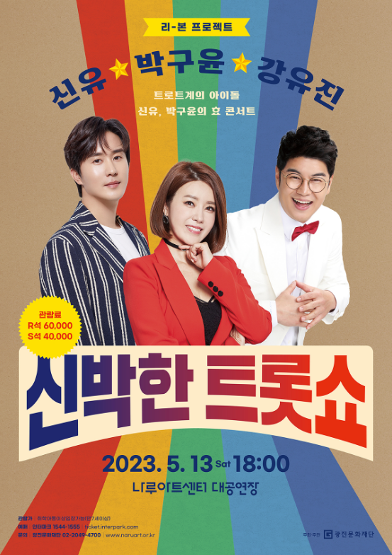 「신박한 트롯쇼」는 트로트계의 아이돌이자 동갑내기 가수인 신유, 박구윤은 물론 특별 게스트 강유진이 함께하는 공연으로 5월 가정의 달을 맞아 광진문화재단에서 준비한 효 콘서트이다.