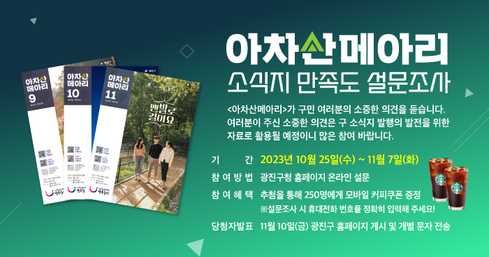 구 소식지 <아차산메아리>가 더 나은 방향으로 나아갈 수 있도록 만족도 조사를 실시하오니 많은 참여 바랍니다.