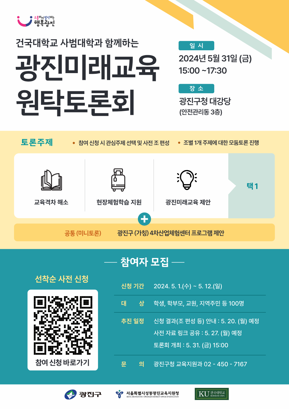 광진구 교육 발전을 위한 소통의 장으로 ‘광진미래교육 원탁토론회’를 개최합니다. 관심있는 교육 현안에 대한 조별 토론으로 즐겁고 유의미한 시간이 될 수 있도록 준비 중이니, 부담가지지 마시고 참여하셔서 좋은 의견 공유 부탁드립니다. - 참여 신청 - ○ 온라인 사전 신청 : https://moaform.com/q/Vf39u9 (선착순 100명) ○ 신청기간 : 2024. 5. 1.(수) ~ 5. 12.(일) ※ 참여자 전원 소정의 기념품 제공 예정