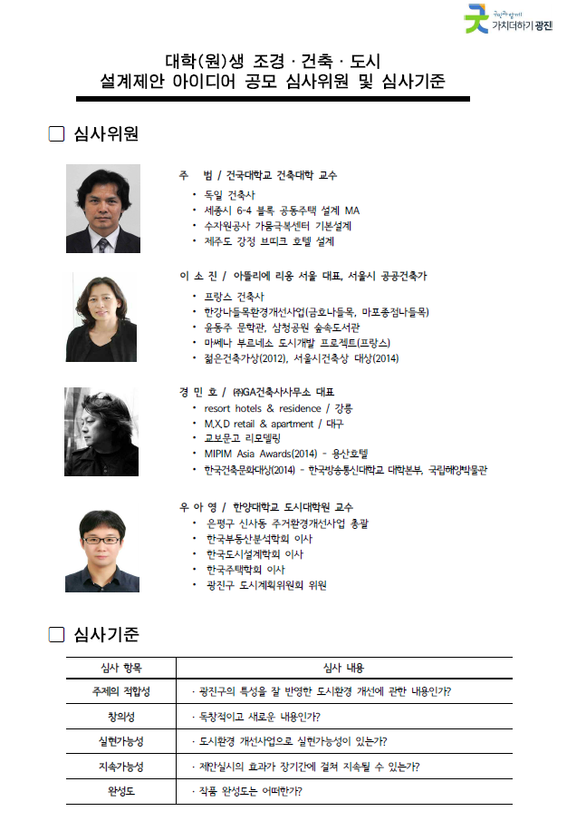 - 대학(원)생 조경․건축․도시 설계제안 아이디어 공모 심사위원 및 심사기준