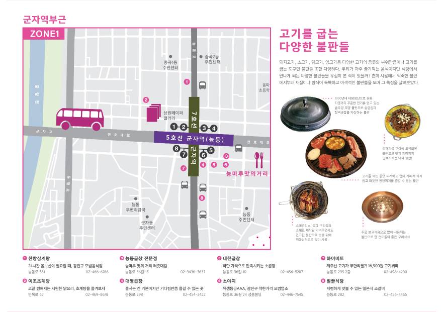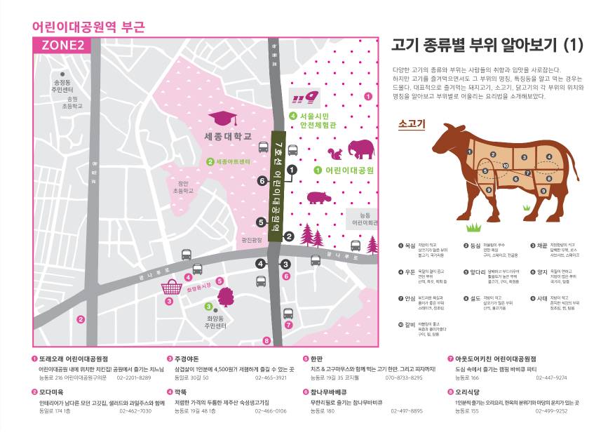 어린이대공원과 세종대학교가 있는 구역으로 다양하고 특색있는 구성과 분위기의 고기가게들을 만날 수 있다.
