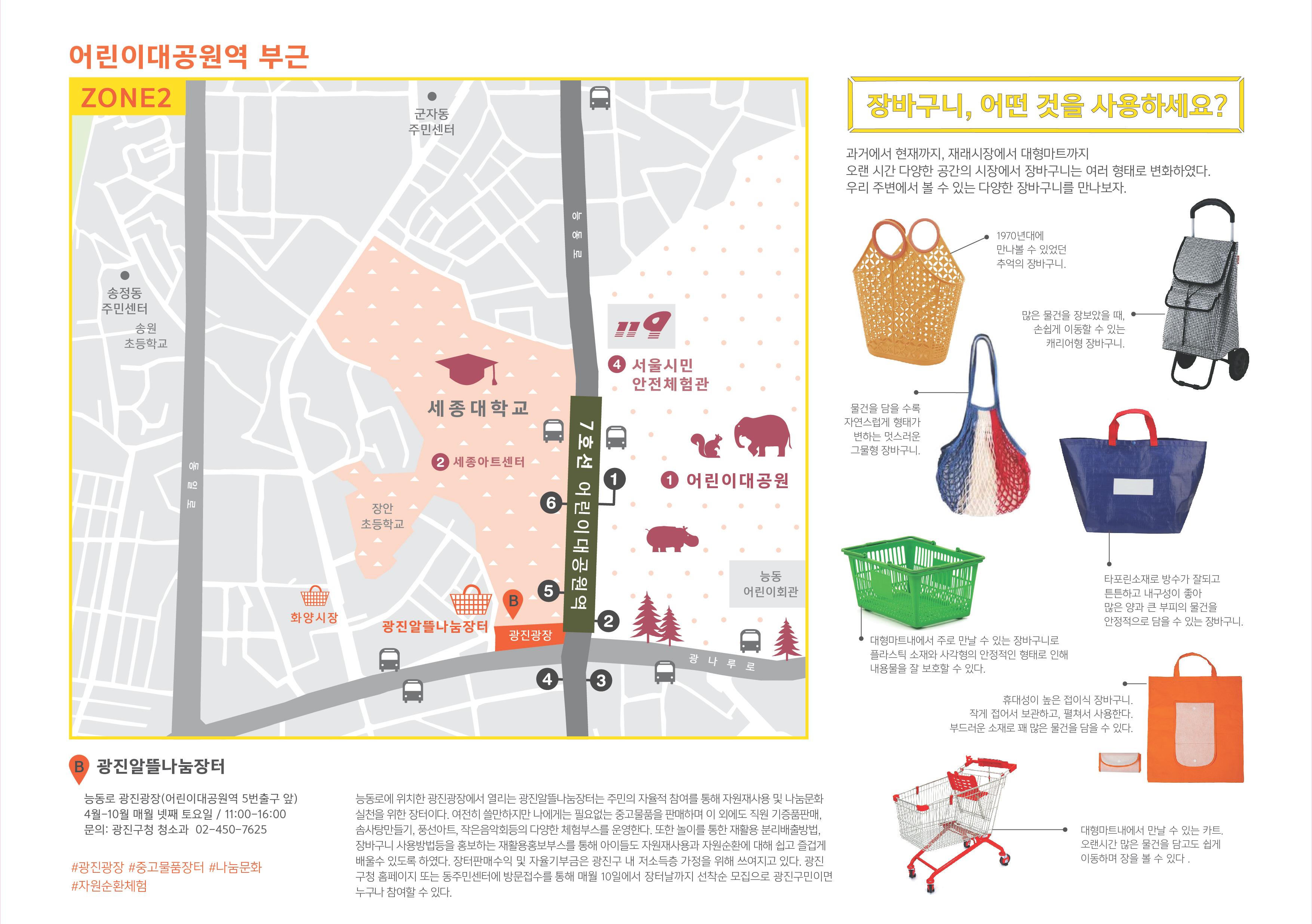 - 어린이대공원과 세종대학교가 있는 구역으로 자원재사용 및 나눔문화실천을 위한 알뜰나눔장터를 만날 수 있다.