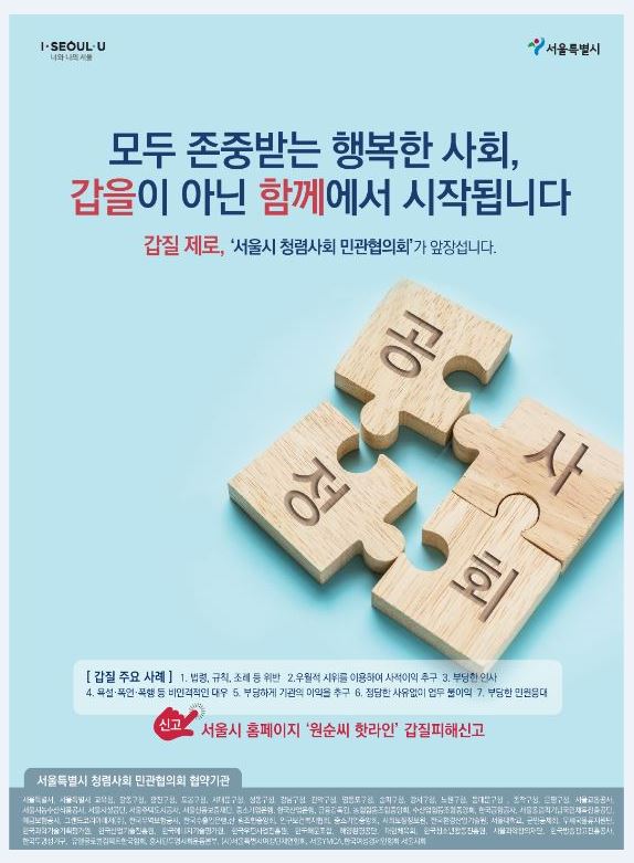청렴문화 확산 및 실천을 위한 서울특별시 청렴사회 민관협의회 협약 대표 이행과제에 대한 홍보 캠페인입니다.